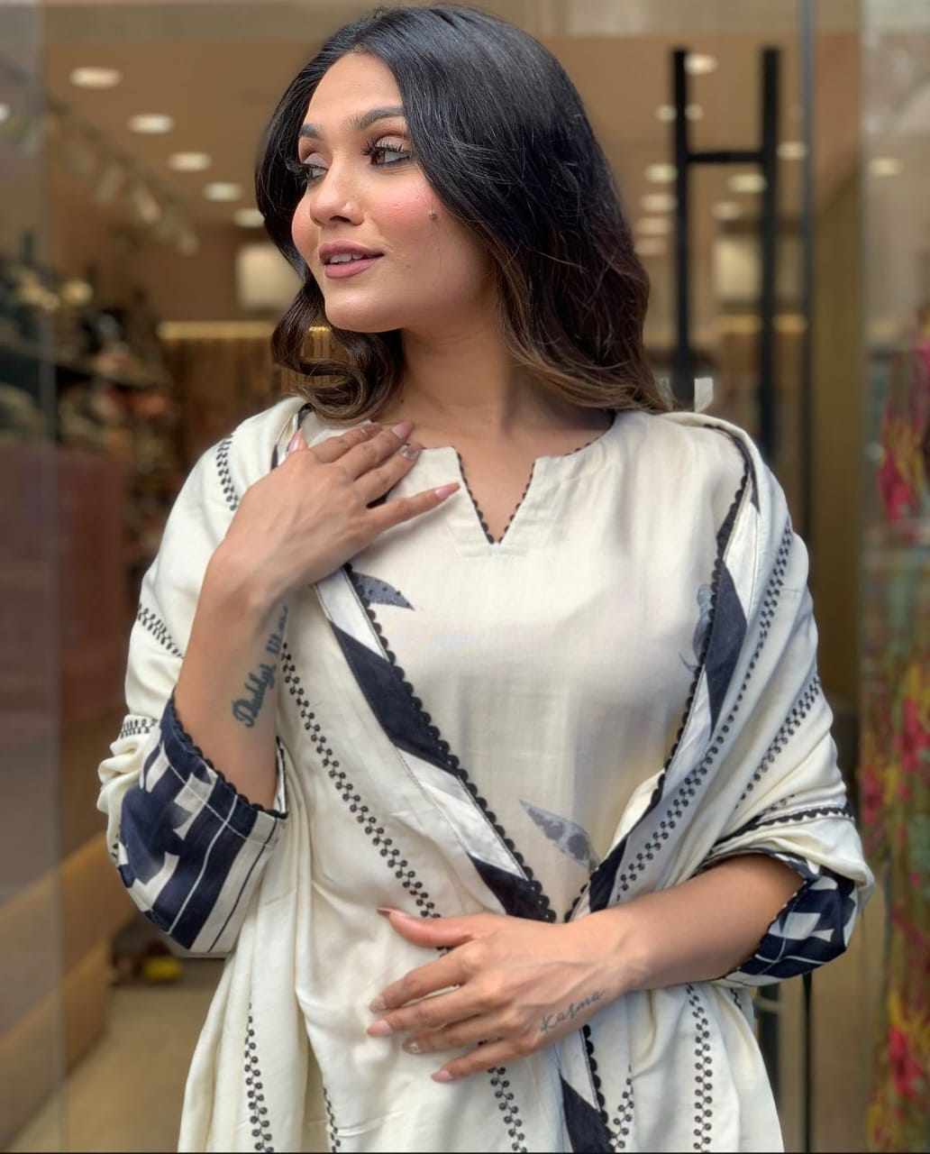 Featuring Fully Elegant Pure Muslin Suit Set Which is Beautifully Decorated With Beautiful Flower Print And Lace Detailing. It Is Paired With Matching Pants And Printed Dupatta